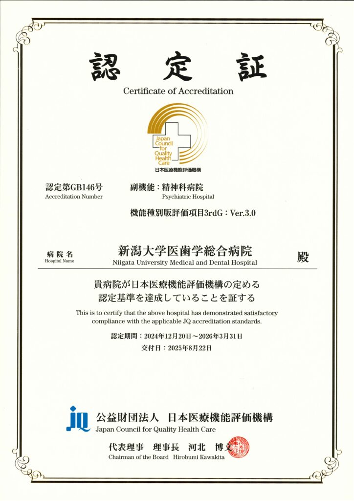 新潟大学医歯学総合病院は、公益財団法人日本医療機能評価機構による病院機能評価を受審し、令和7年8月22日付けで認定証が交付されました。