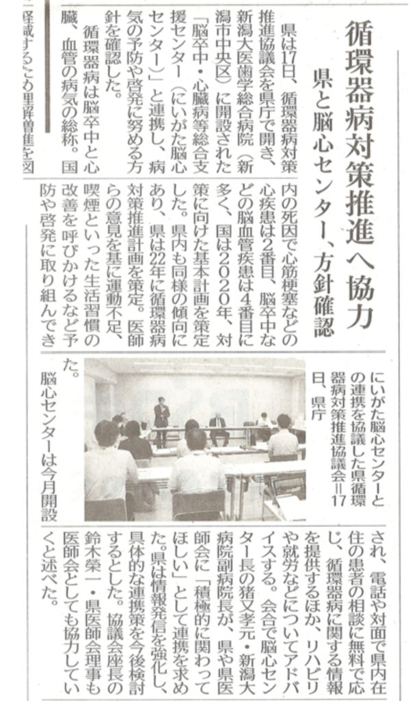 7月17日新潟県庁にて新潟県循環器病対策推進協議会が開かれ、新潟日報に報道されました。新潟県はにいがた脳心センターと協働し、循環器病の予防や啓発、医療連携の形作りを目指すことになりました。