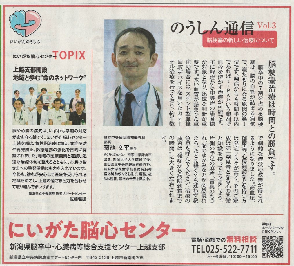 のうしん通信として4回にわたり、脳卒中と心臓病のおはなしを新潟日報に掲載しています。