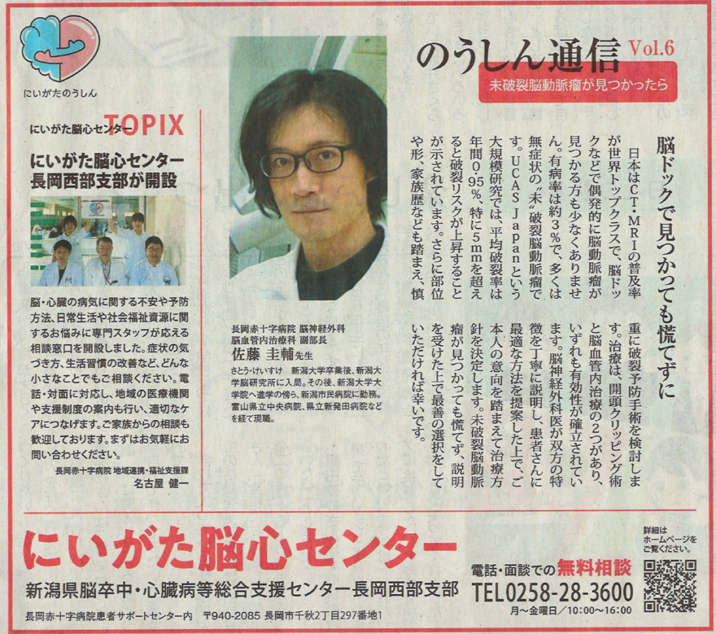 今回は長岡赤十字病院 佐藤圭輔先生に、未破裂脳動脈瘤が見つかったら、についてお話しいただきました。