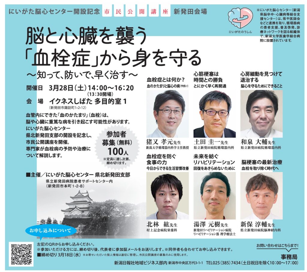 にいがた脳心センター県北新発田支部が発足いたしました。このたび県北新発田支部が中心になり、『脳と心臓を襲う「血栓症」から身を守る』と題して市民公開講座を開催いたします。